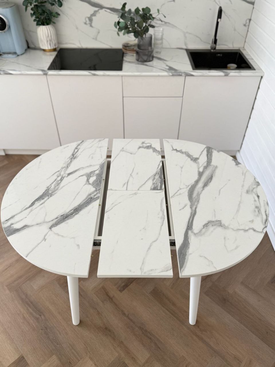 Цвет Белый мрамор, материал покрытия столешницы - влагостойский пластик с белой царгой и белой окантовкой на деревянных ножках.