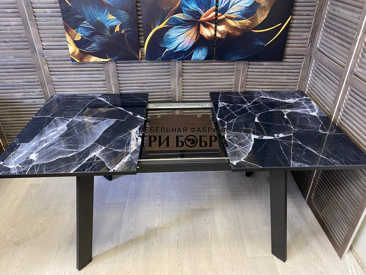 Современный механизм "бабочка" делает процесс раскладывания стола быстрым и легким даже для одного человека. Вставка стола продолжает основной рисунок, создавая единый и гармоничный вид.