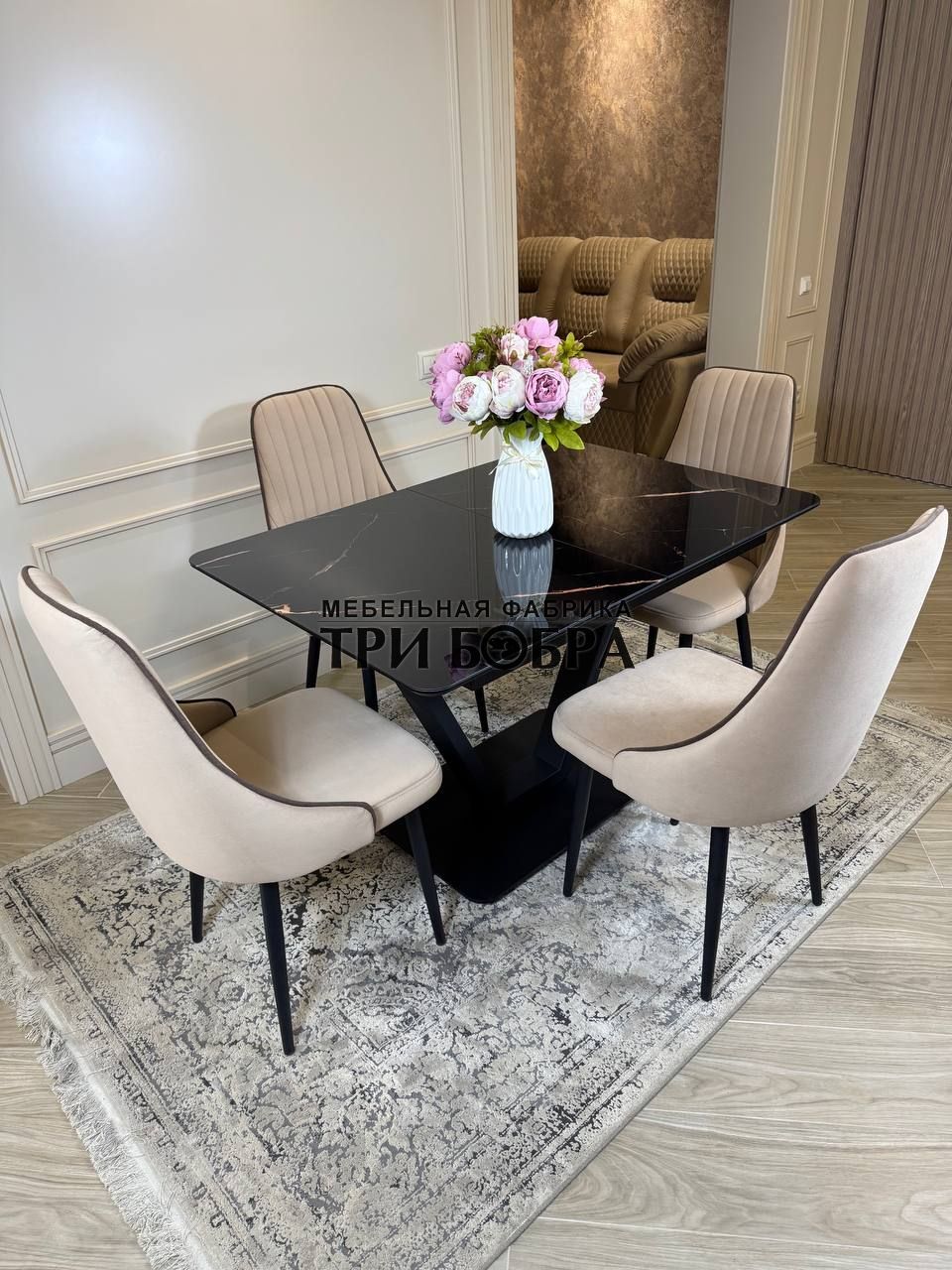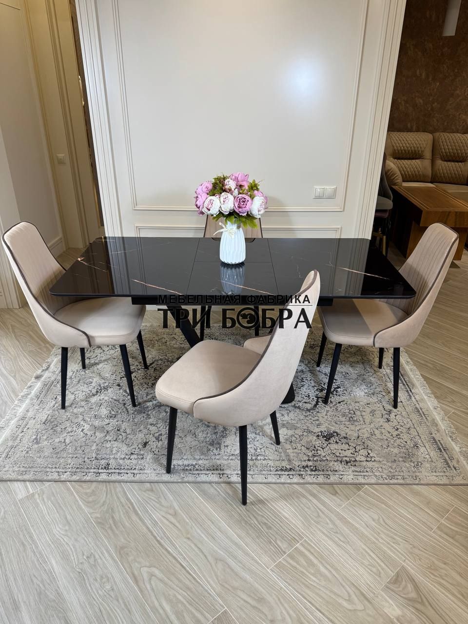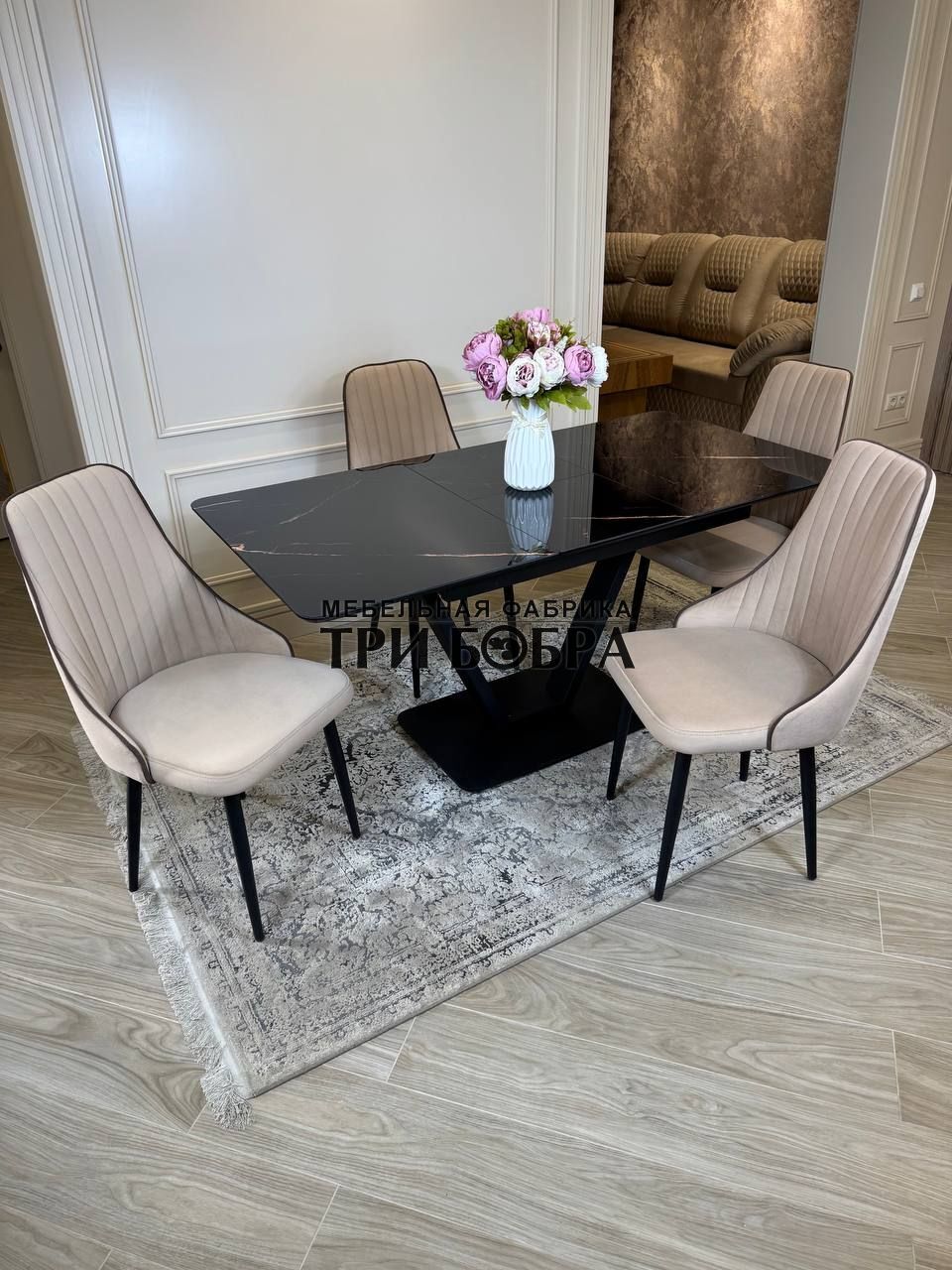 Стол обеденный раздвижной "ЛЕОН" черный мрамор и 4 стула "Сорренто"