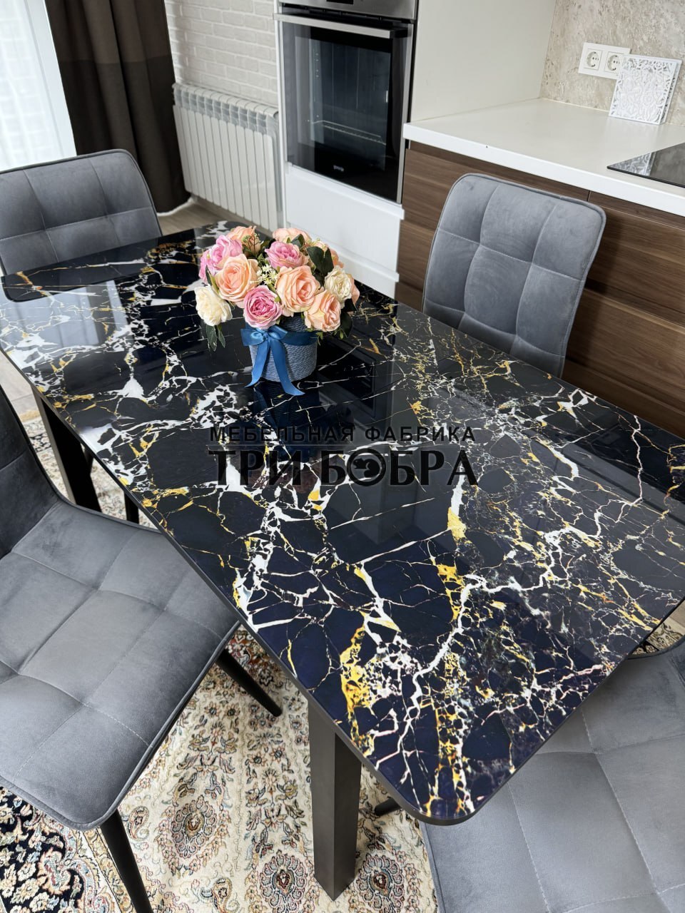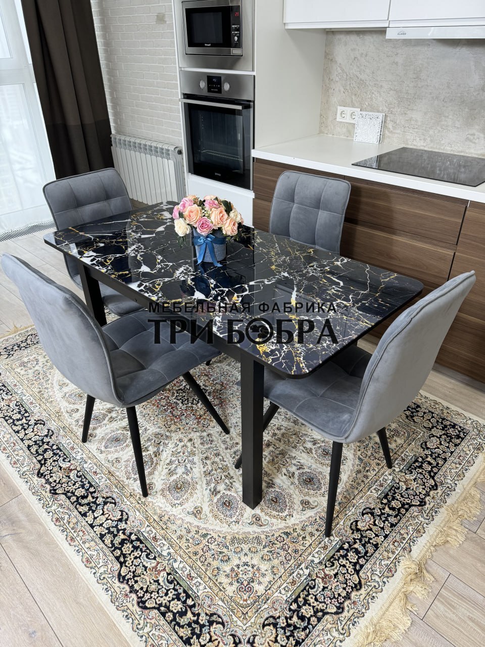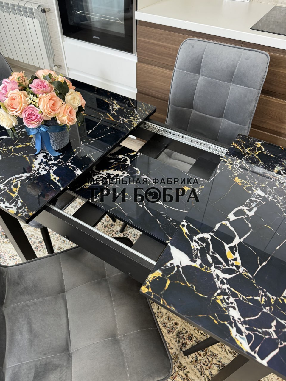 Стеклянный раздвижной стол "Черный мрамор" и стулья "ГУЧИ" серый