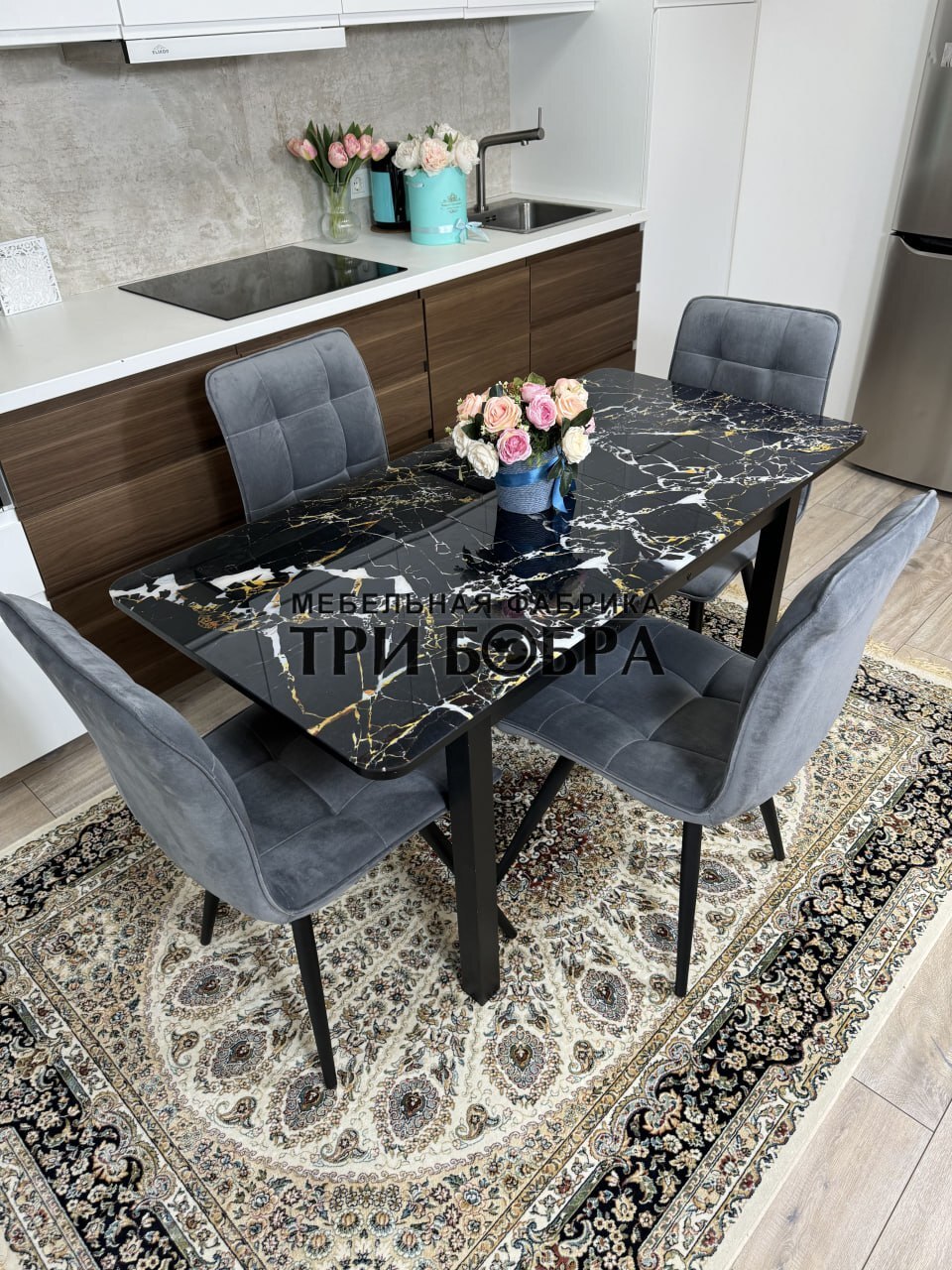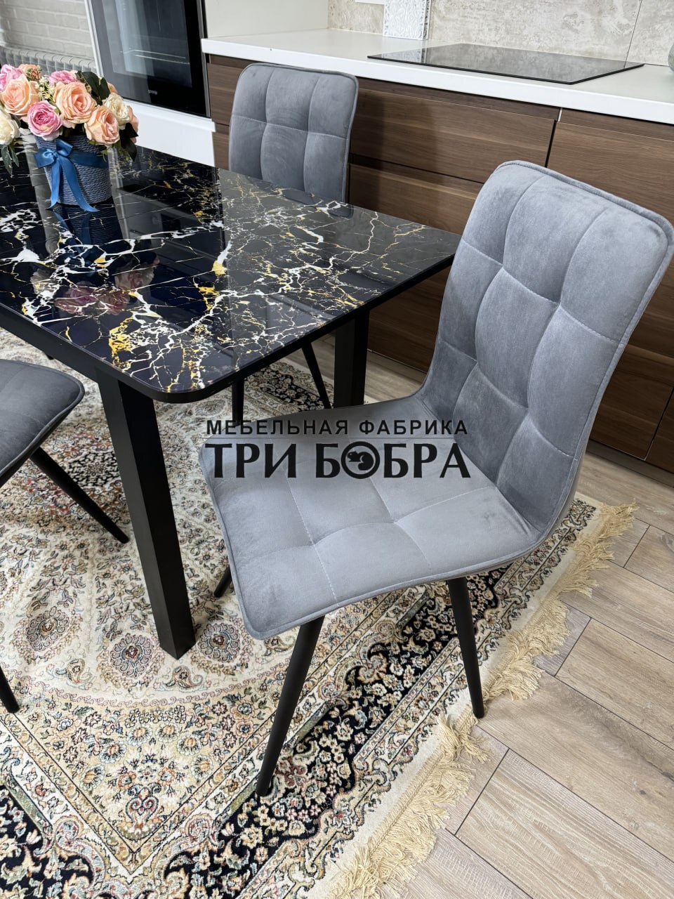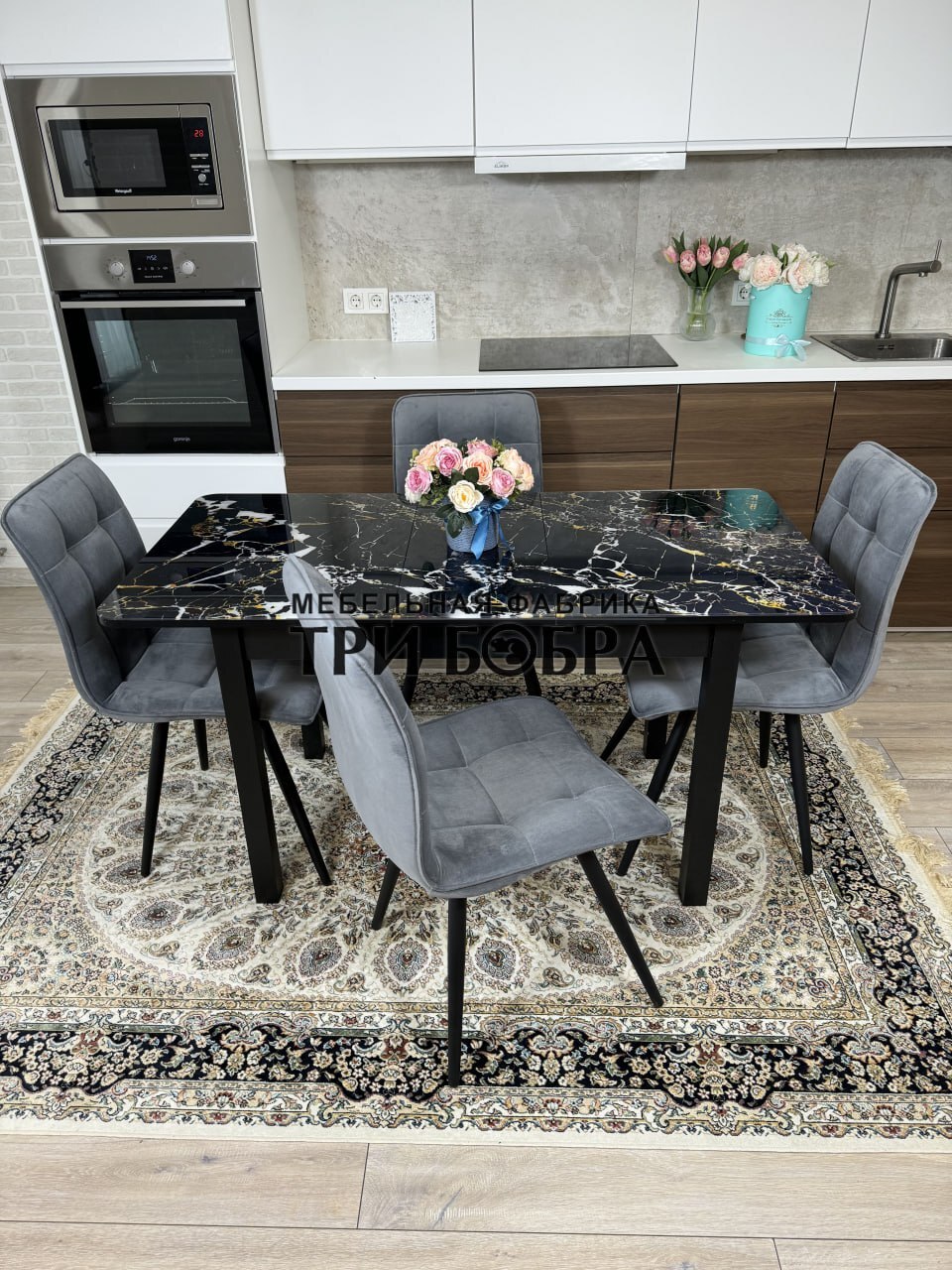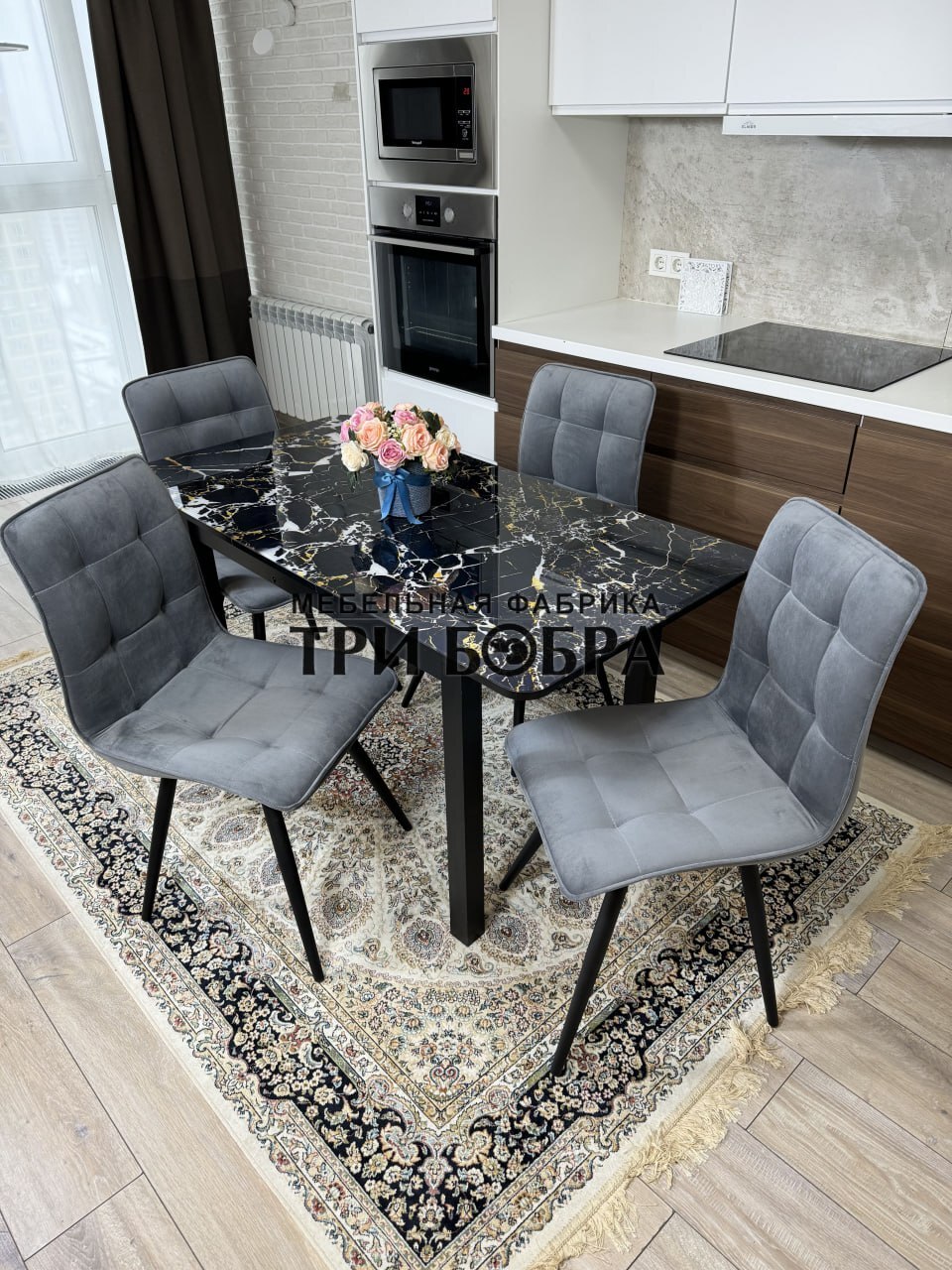 Стеклянный раздвижной стол "Черный мрамор" и стулья "ГУЧИ" серый