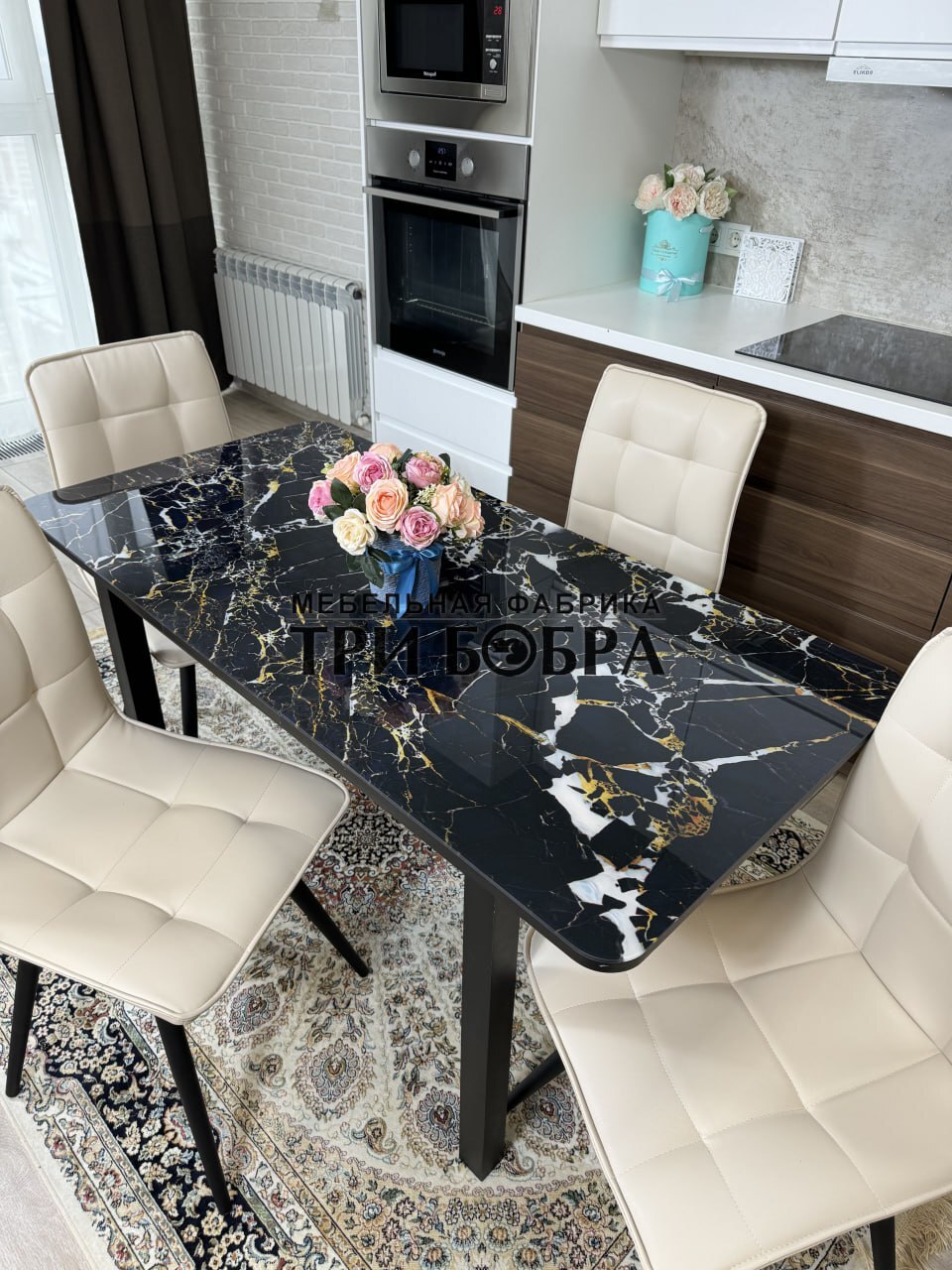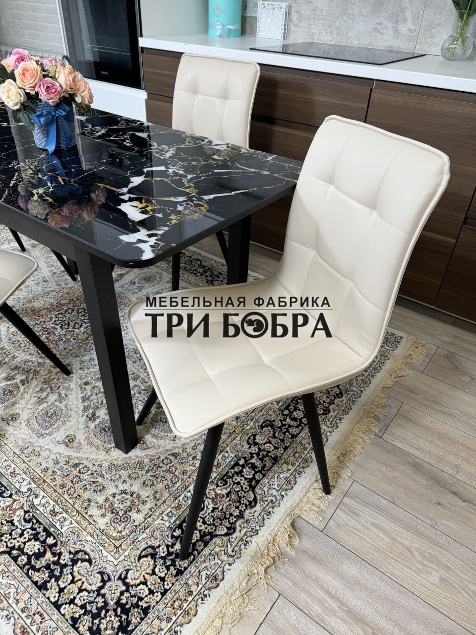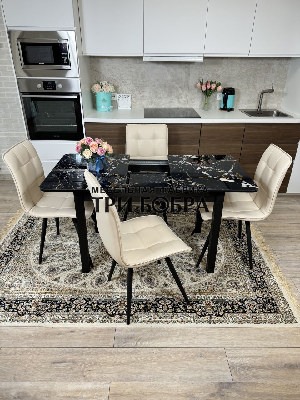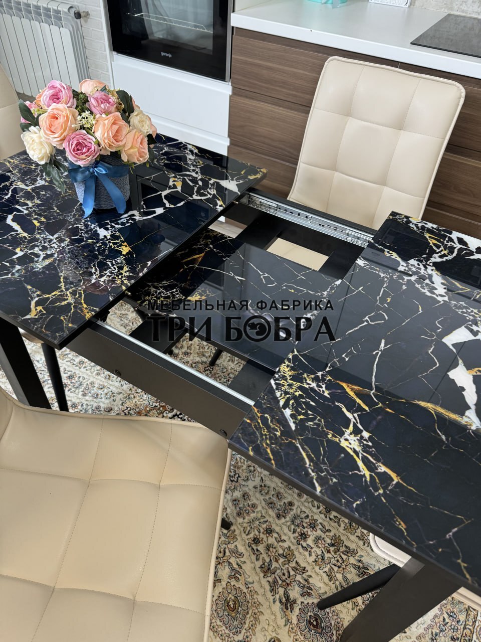 Стеклянный раздвижной стол "Черный мрамор" и стулья "ГУЧИ" ваниль