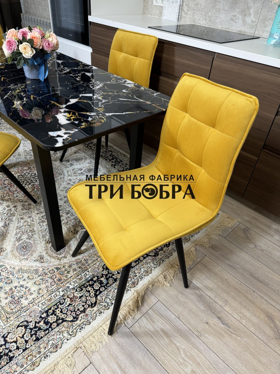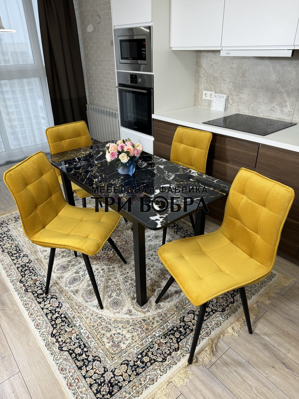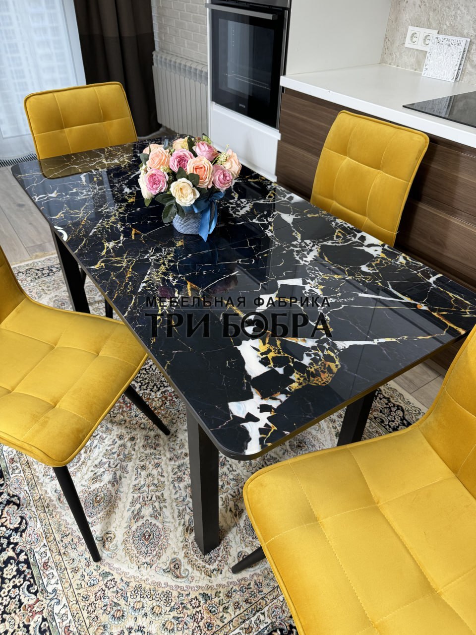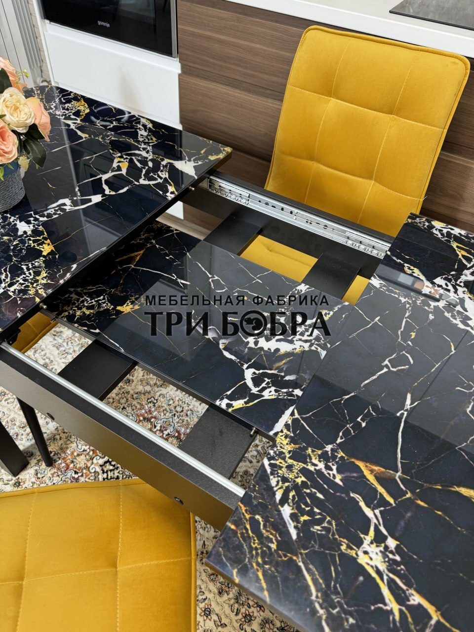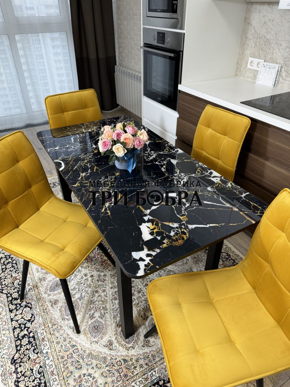 Стеклянный раздвижной стол "Черный мрамор" и стулья "ГУЧИ" желтый