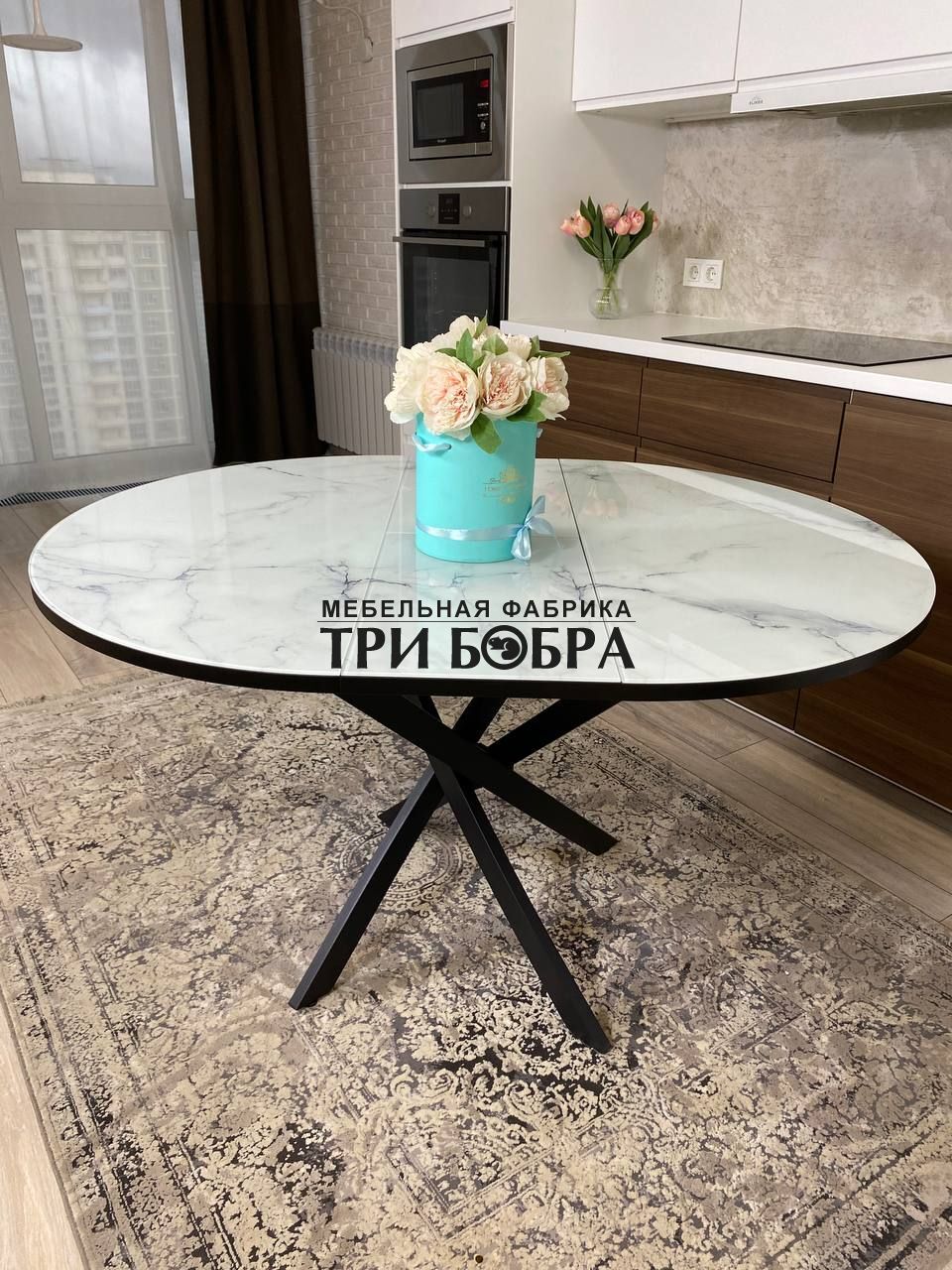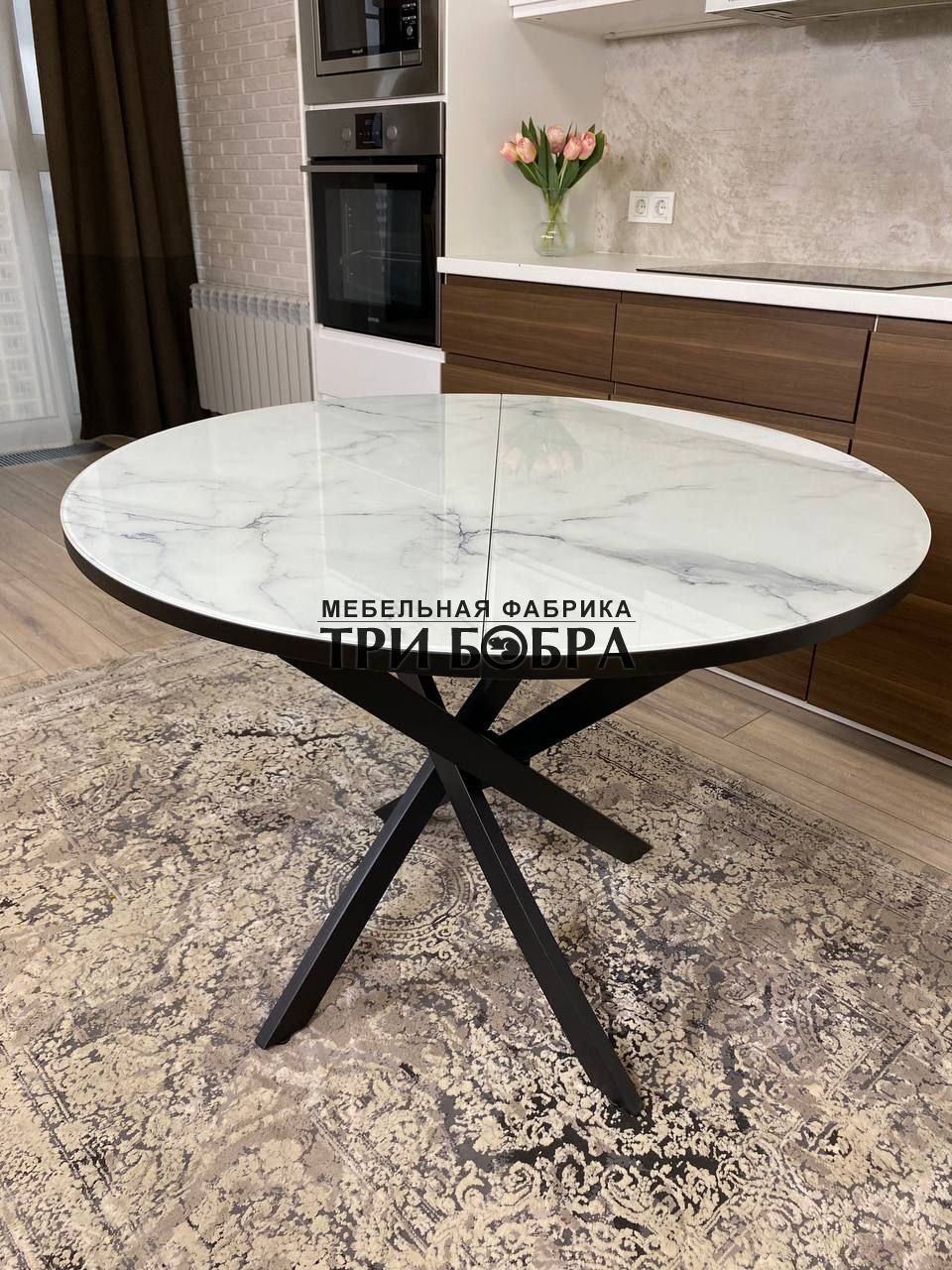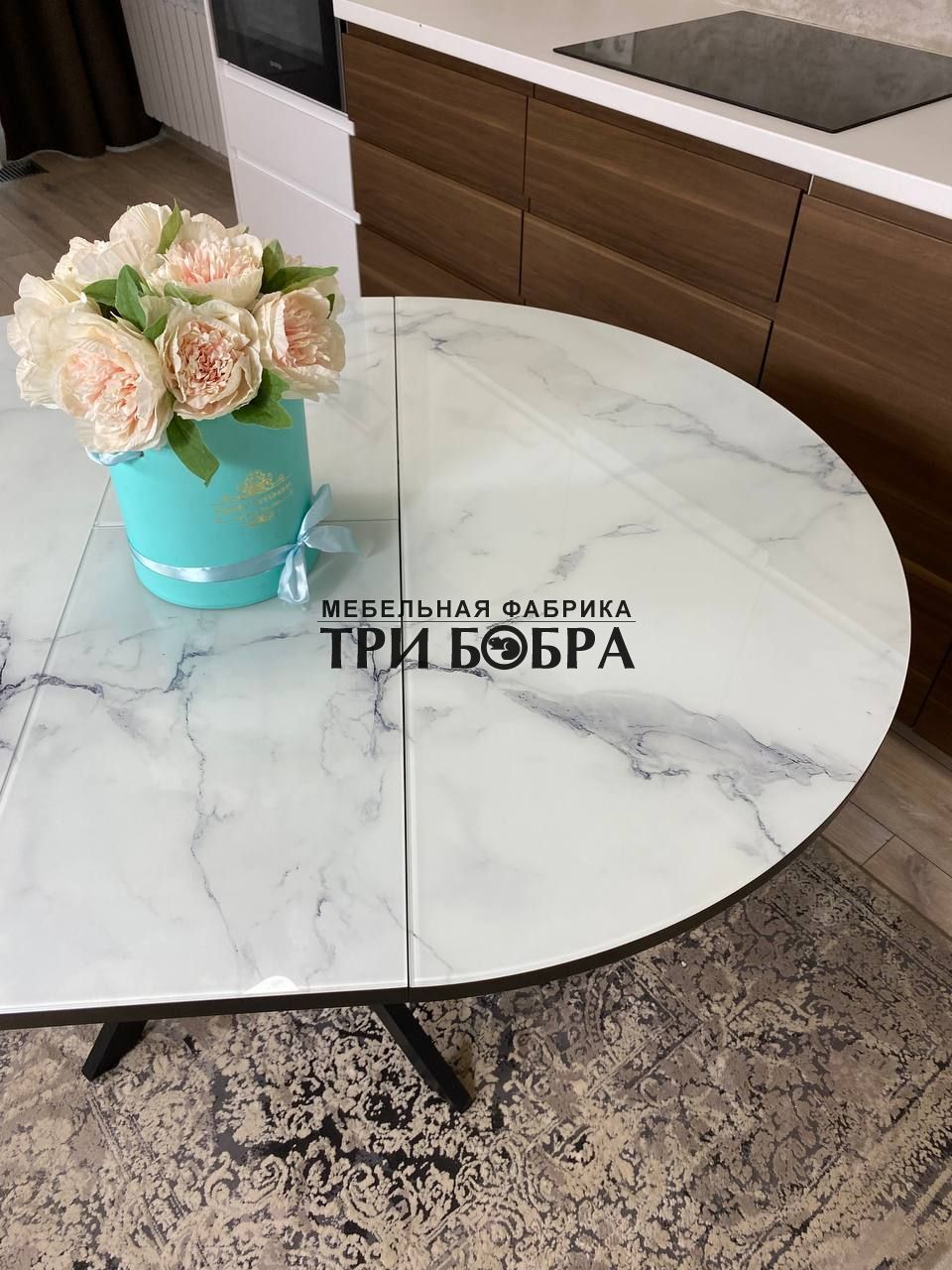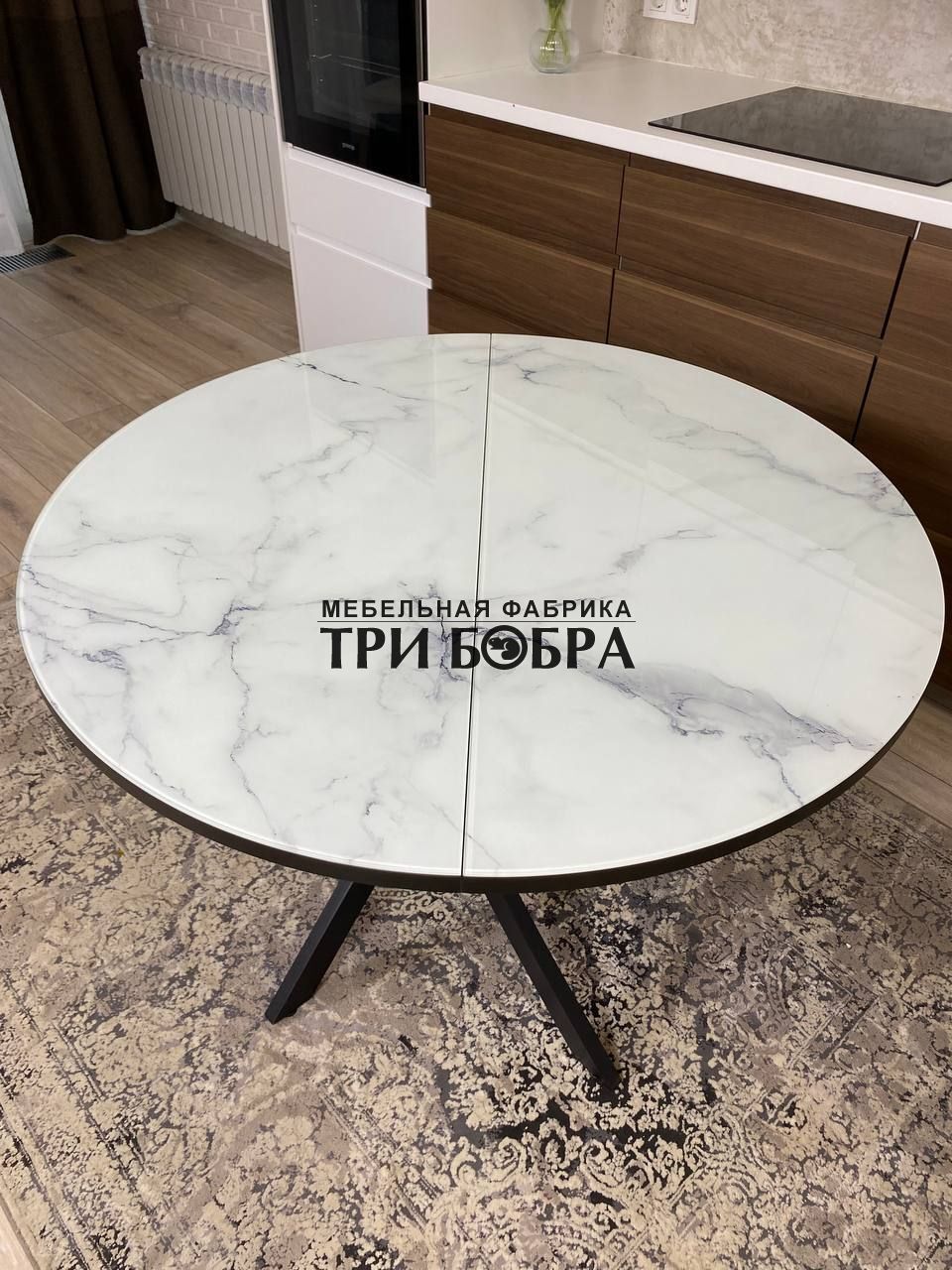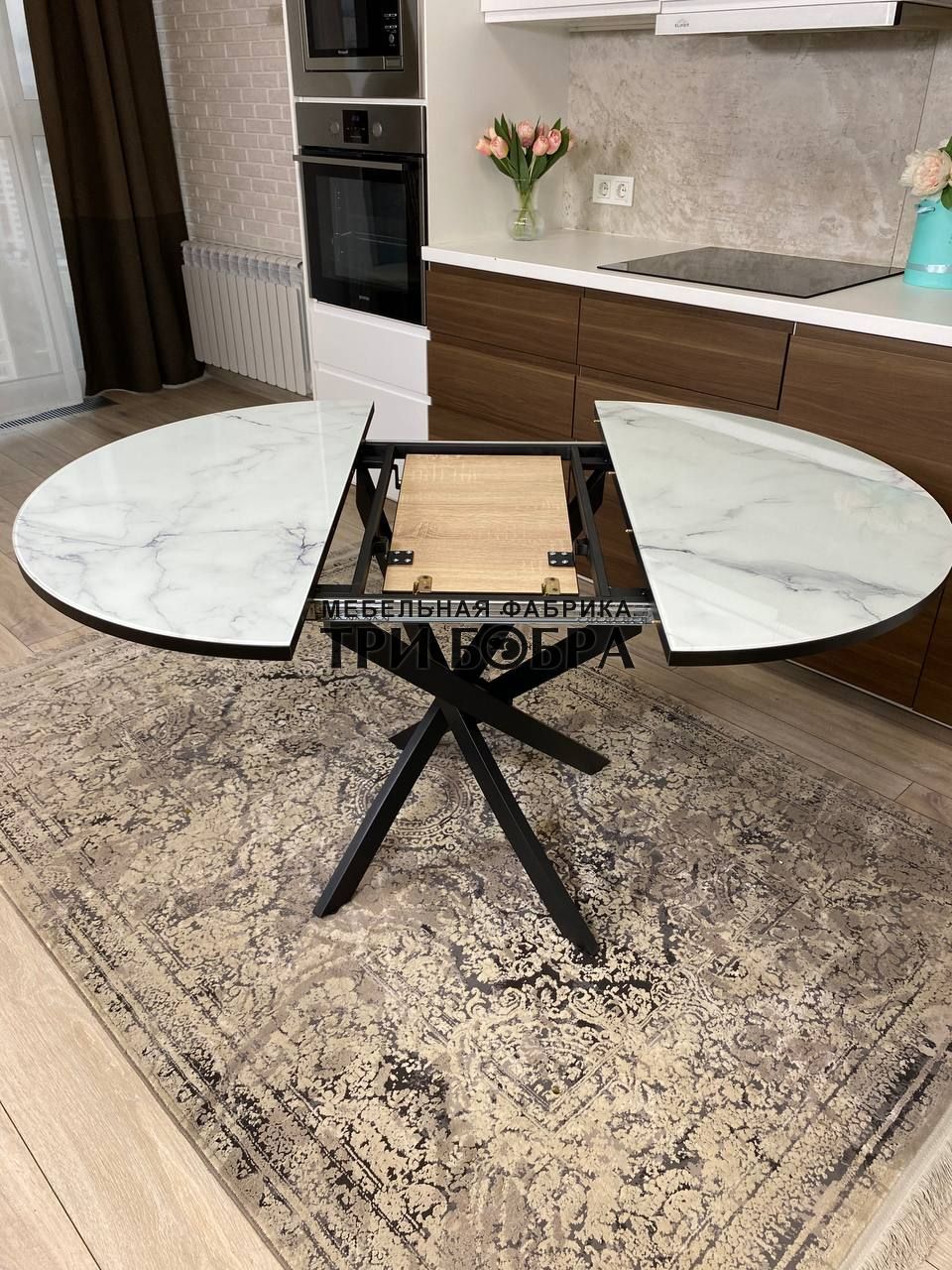 Важной особенностью этого стола является наличие вкладки длиной 30 см, которая прекрасно продолжает рисунок столешницы, создавая единый и гармоничный вид.